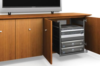 CREDENZA AV RACK -Rotating slide-out AV equipment rack simplifies equipment installation in cabinet and shortens 90 degree rotation ability for equipment servicing, ability to lock in extended and rotated positions, lockable (with included hardware), and a black brushed anodized finish. ... Get Content Here